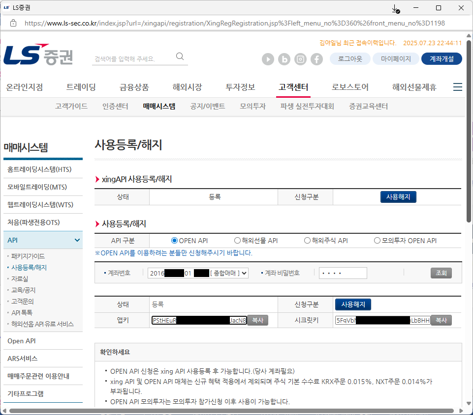 API 신청/해지 탭을 선택 후, 이용약관에 동의후, [신청]을 누르면, 상태가 [등록]으로 표시된다.