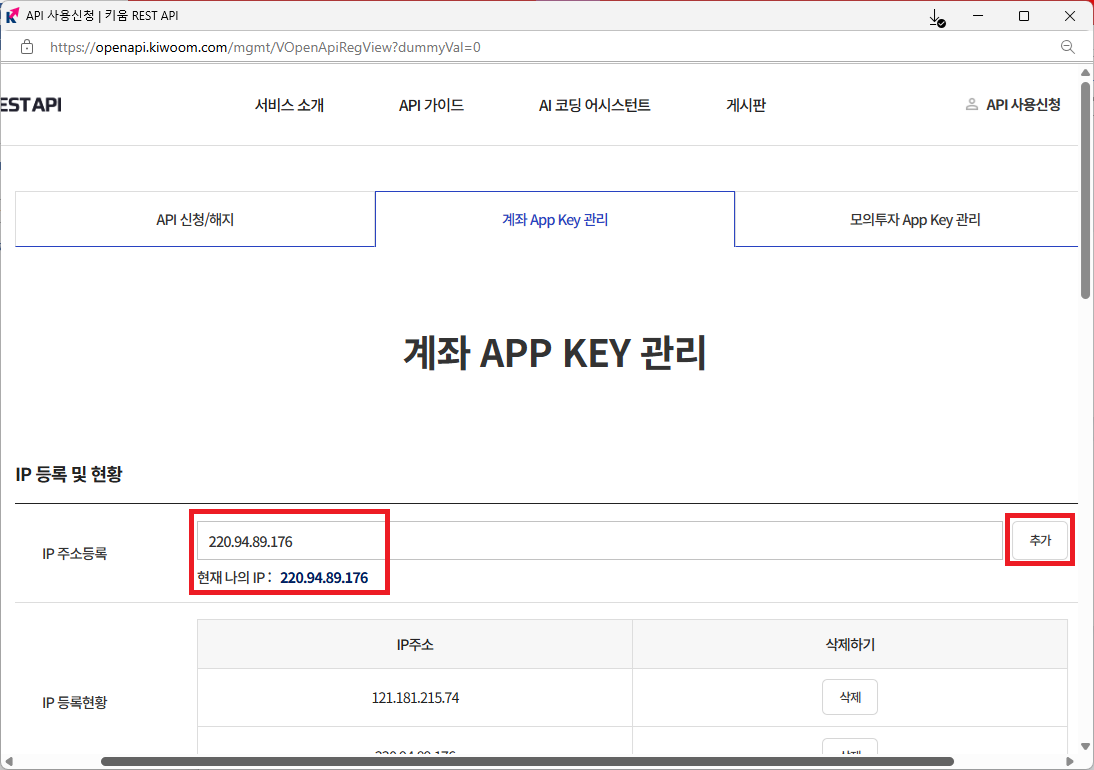 - IP 등록, 계좌 등록 및 APP KEY/SECRET KEY 다운로드¶